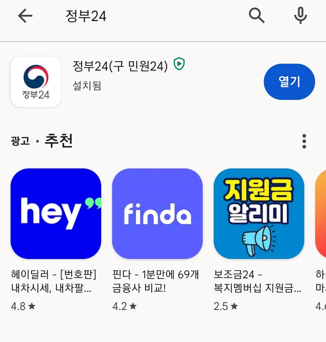 1) 플레이스토어 또는 앱스토어에서 "정부24(구 민원24)" 어플 실행