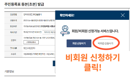 2) 자주찾는 서비스 - 주민등록등본 - 비회원 신청하기 - 발급